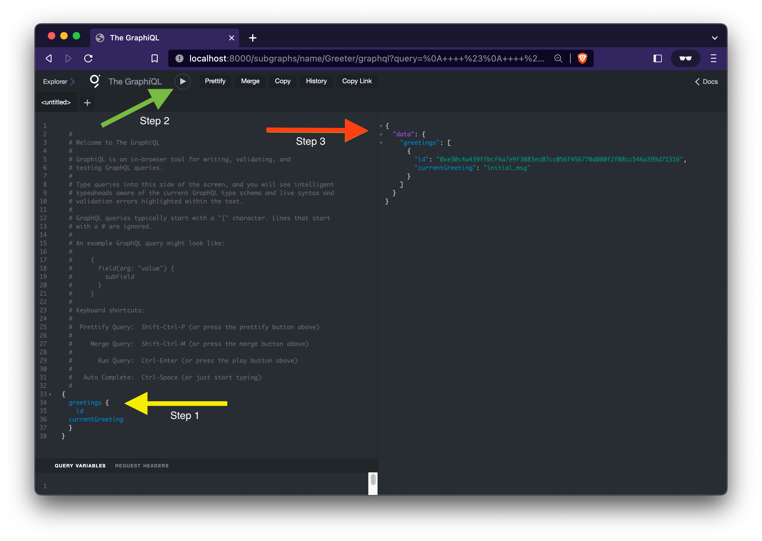 After the subgraph is successfully deployed, open the [GraphQL playground](http://localhost:8000/subgraphs/name/Greeter/graphql?query=%0A++++%23%0A++++%23+Welcome+to+The+GraphiQL%0A++++%23%0A++++%23+GraphiQL+is+an+in-browser+tool+for+writing%2C+validating%2C+and%0A++++%23+testing+GraphQL+queries.%0A++++%23%0A++++%23+Type+queries+into+this+side+of+the+screen%2C+and+you+will+see+intelligent%0A++++%23+typeaheads+aware+of+the+current+GraphQL+type+schema+and+live+syntax+and%0A++++%23+validation+errors+highlighted+within+the+text.%0A++++%23%0A++++%23+GraphQL+queries+typically+start+with+a+%22%7B%22+character.+Lines+that+start%0A++++%23+with+a+%23+are+ignored.%0A++++%23%0A++++%23+An+example+GraphQL+query+might+look+like%3A%0A++++%23%0A++++%23+++++%7B%0A++++%23+++++++field%28arg%3A+%22value%22%29+%7B%0A++++%23+++++++++subField%0A++++%23+++++++%7D%0A++++%23+++++%7D%0A++++%23%0A++++%23+Keyboard+shortcuts%3A%0A++++%23%0A++++%23++Prettify+Query%3A++Shift-Ctrl-P+%28or+press+the+prettify+button+above%29%0A++++%23%0A++++%23+++++Merge+Query%3A++Shift-Ctrl-M+%28or+press+the+merge+button+above%29%0A++++%23%0A++++%23+++++++Run+Query%3A++Ctrl-Enter+%28or+press+the+play+button+above%29%0A++++%23%0A++++%23+++Auto+Complete%3A++Ctrl-Space+%28or+just+start+typing%29%0A++++%23%0A++), where you can execute queries and fetch indexed data.