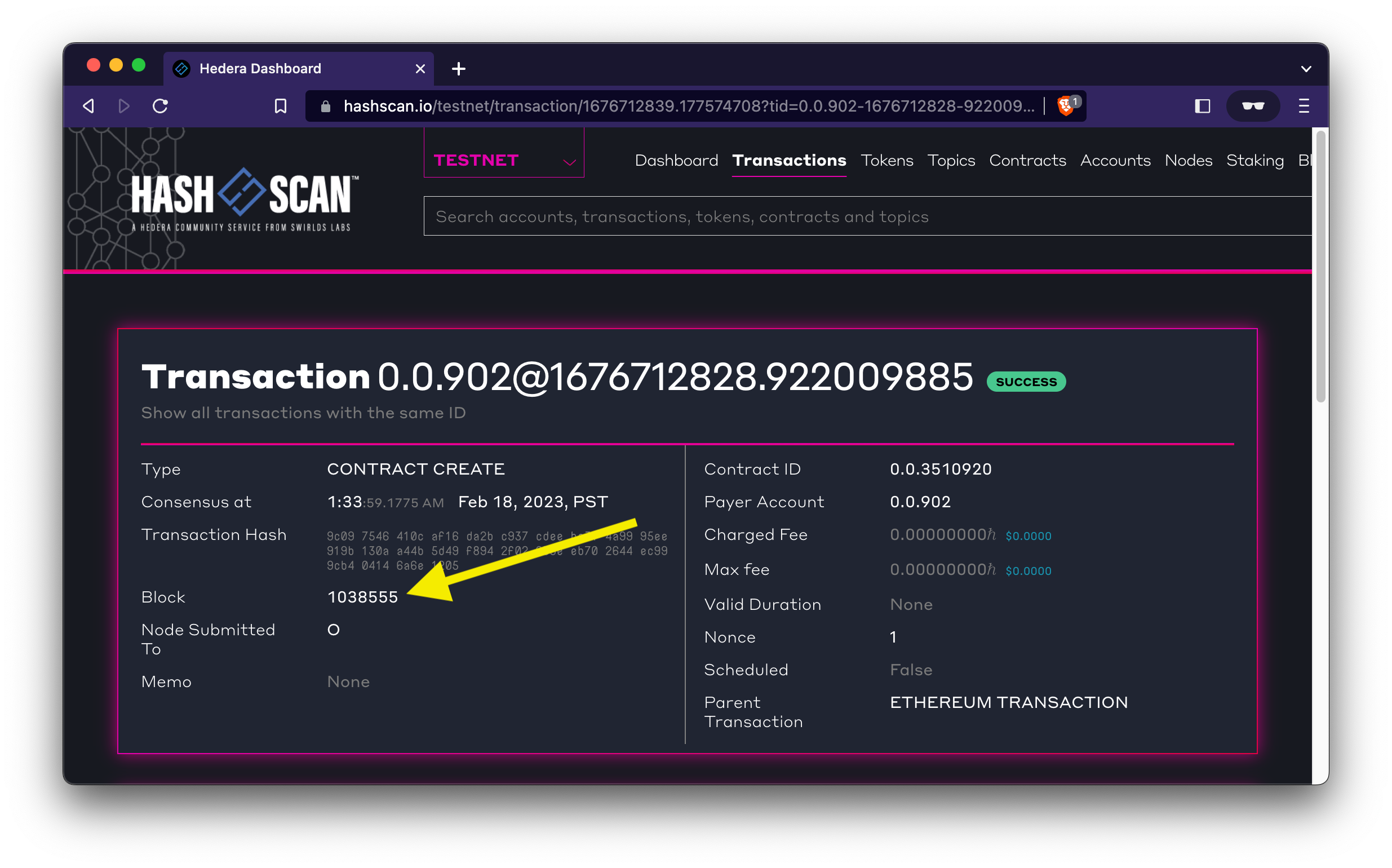 3. Click on the `Create Transaction` ID ([0.0.902@1676712828.922009885](https://hashscan.io/testnet/transaction/1676712839.177574708?tid=0.0.902-1676712828-922009885)).